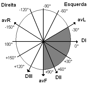 Iniciamos a análise do QRS avaliando a orientação do QRS (6º passo); normalmente, no plano frontal, se encontra entre -30º e +90º. Quando além de -30º, considera-se desviado à esquerda. Além de +90º, desvio para direita. No plano horizontal, considera-se normal quando orientado para trás (ou seja, QRS negativo em V1).