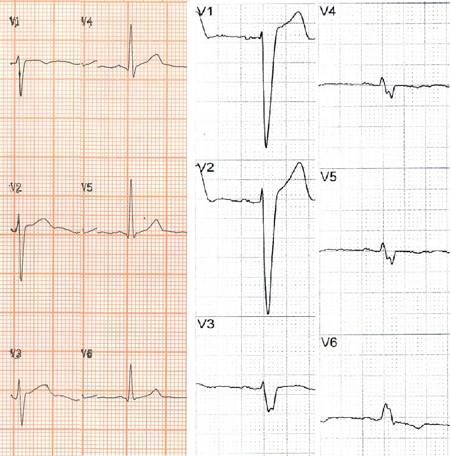 de ondas R amplas em V5 e V6 acompanhadas de ondas T negativas e