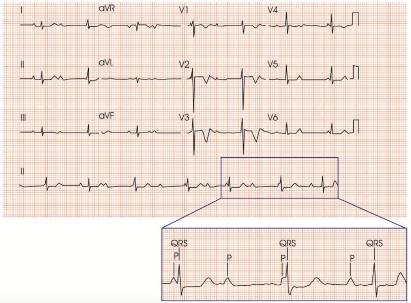 Trata-se de um tipo de arritmia que chamamos de bloqueio atrioventricular total (BAVT).