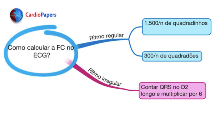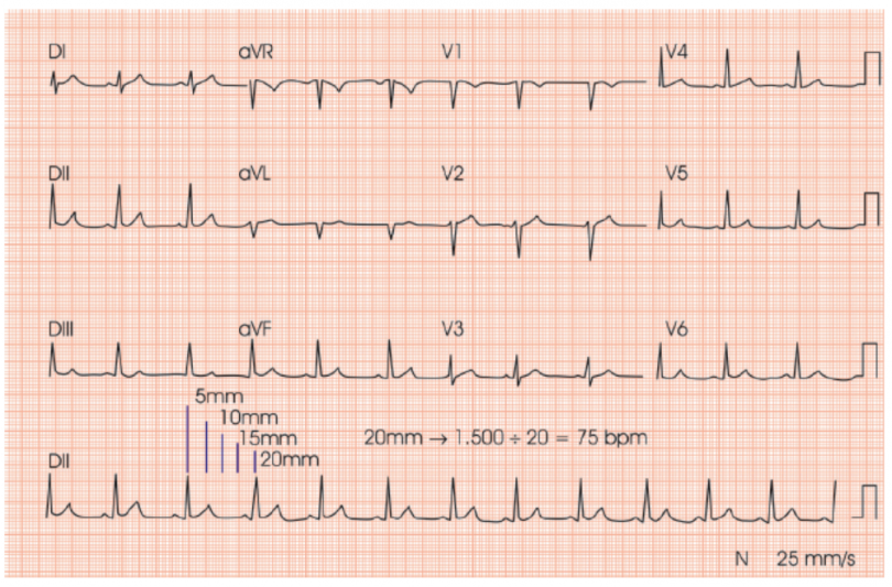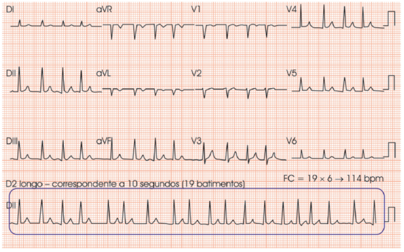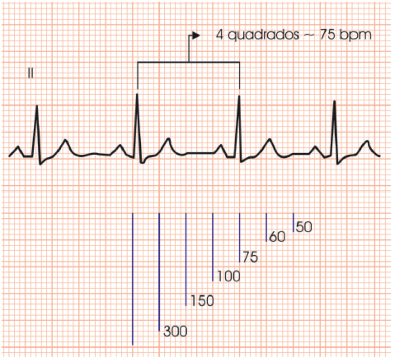 Assim, uma distância entre o R-R de 2 quadrados (que seria 10mm) representaria uma FC de 150bpm; de 3 quadrados, 100bpm; de 4 quadrados, 75bpm; de 5 quadrados, 60bpm, e assim por diante.