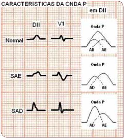 Assim, se houver uma sobrecarga de átrio esquerdo (SAE), esperamos que a onda P fique entalhada e bífida em DII, com duração ≥ 120 ms (3mm), e com o componente final negativo em V1 > 1mm de amplitude e 40ms de duração (Morris). Pode haver também desvio do eixo da onda P para esquerda.
