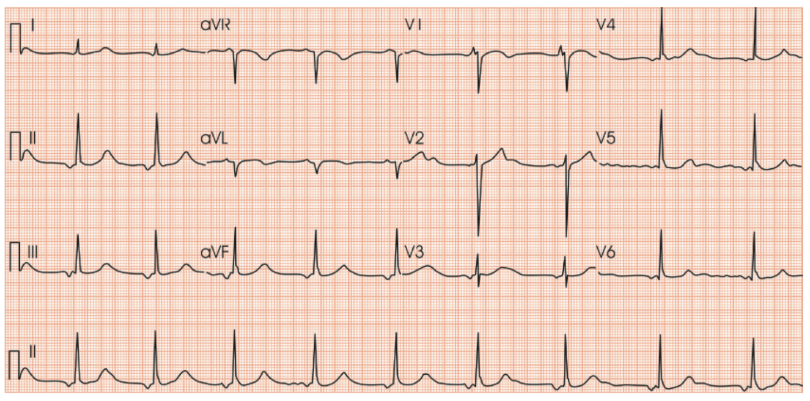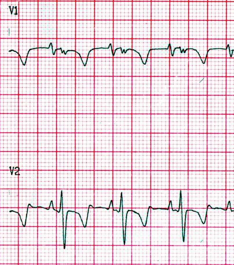 Exemplo de sinal de Peñalosa-Tranchesi – notar que o qrs em V1 é diminuto, havendo um rápido aumento de voltagem do QRS em V2.