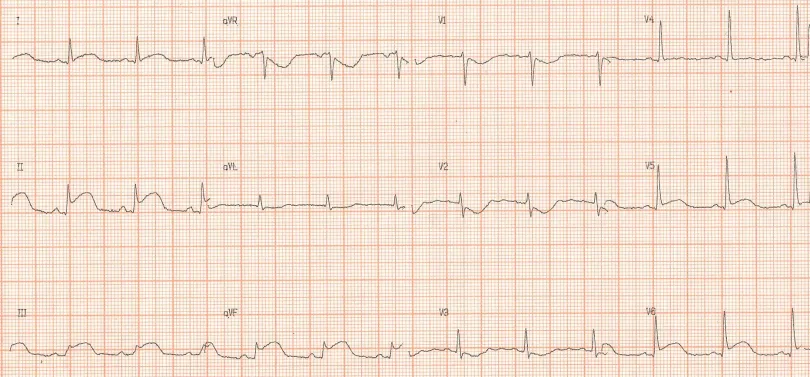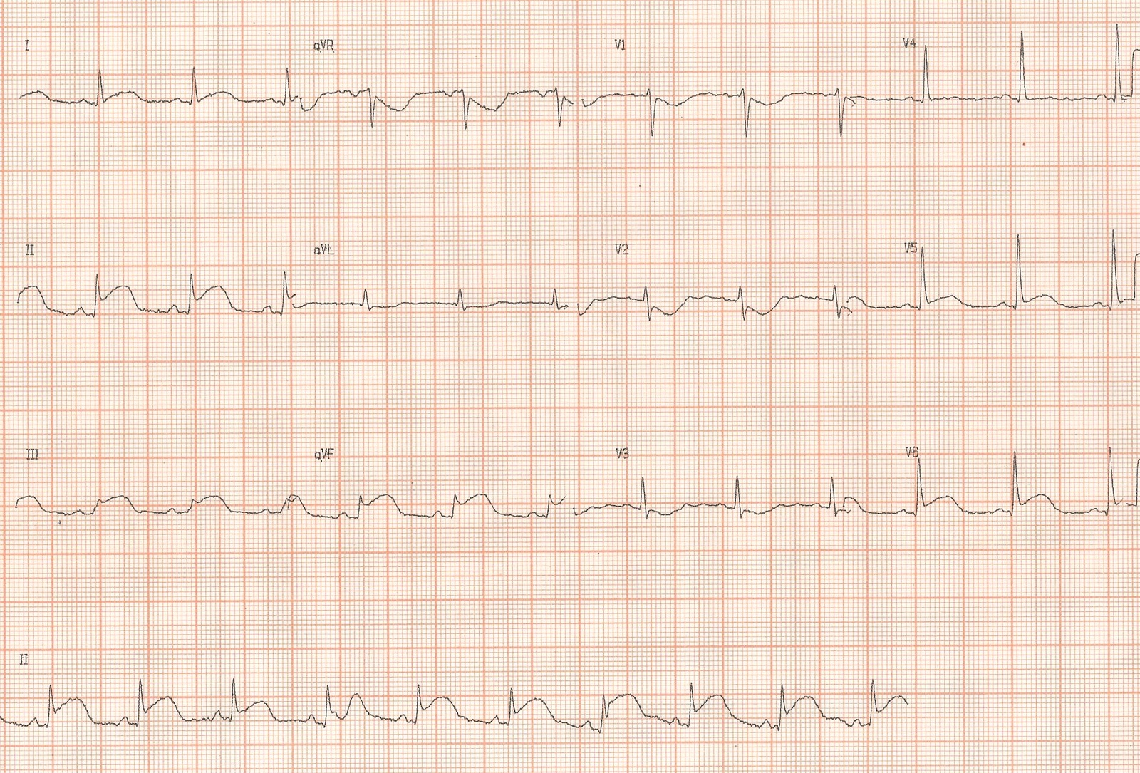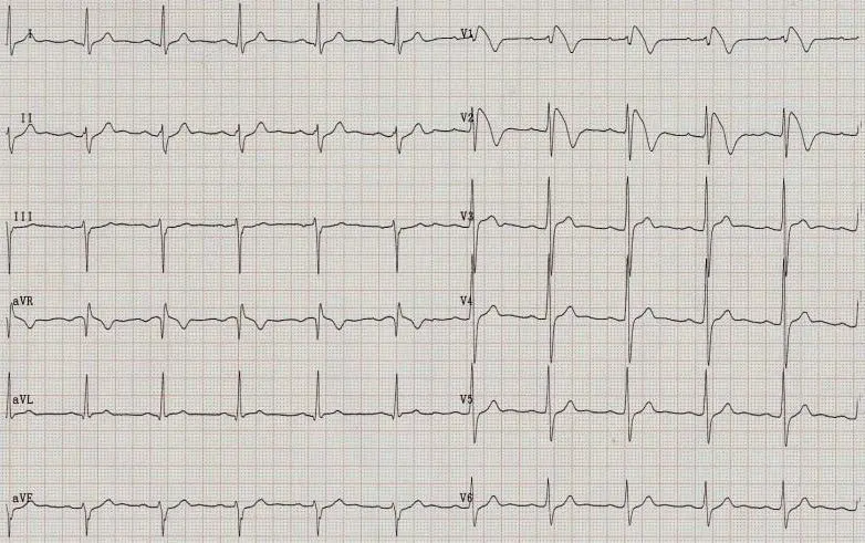 Segue o exemplo de um ECG com infra-desnivelamento de ST padrão strain por sobrecarga de ventrículo esquerdo: