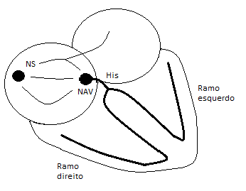 O estímulo elétrico inicia-se normalmente nas células do nó sinusal (NS). Após passar pelo nó átrio-ventricular (NAV), a condução elétrica percorre rapidamente os feixes de His, estimulando os 2 ventrículos a partir do endocárdio.