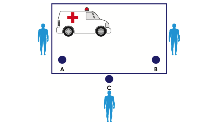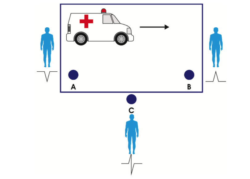 Obviamente, isso não poderá ser feito pela visão; a escuridão é completa, mas é possível ,sim, ter uma noção da movimentação do veículo através do barulho de sua sirene. Como se sabe, à medida que uma ambulância se aproxima de uma pessoa, o som que esta escuta ca cada vez mais agudo. Quando ela se afasta, o contrário ocorre e o som torna-se cada vez mais grave.Imagine então que nós colocamos 3 pessoas espalhadas ao redor do campo.