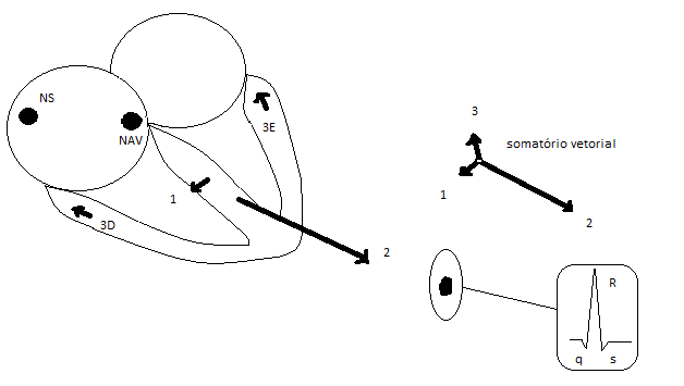 Na despolarização atrial, como o nó sinusal se encontra na porção superior do átrio direito, ocorre primeiro a despolarização desse átrio (AD), seguido da depolarização do átrio esquerdo, formando um vetor resultante para esquerda e para baixo. Na despolarização ventricular, primeiro ocorre a ativação do septo interventricular (1). Depois, como a massa do VE é maior que a do VD, o vetor resultante dessa fase 2 normalmente se dirige para esquerda (2). E por último ocorre a ativação das porções basais dos ventrículos, formando o vetor (3). Esses três vetores foram, no traçado eletrocárdiografico, o complexo QRS, conforme mostrado abaixo.