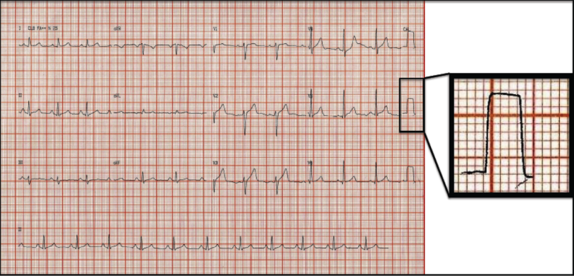 Para confirmar então que a padronização está normal, devemos procurar o retângulo que fica nas laterais do papel do ECG. Este retângulo deve ter 10 quadradinhos de altura e 5 quadradinhos de duração. Exemplo: