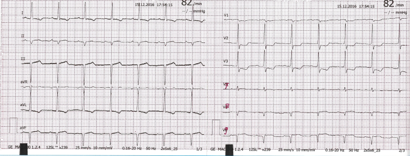 Feito ECG com V7, V8 e V9, sendo demonstrado supra de ST em V8 e V9, o que confirmou o diagnóstico de IAM com supra de ST.