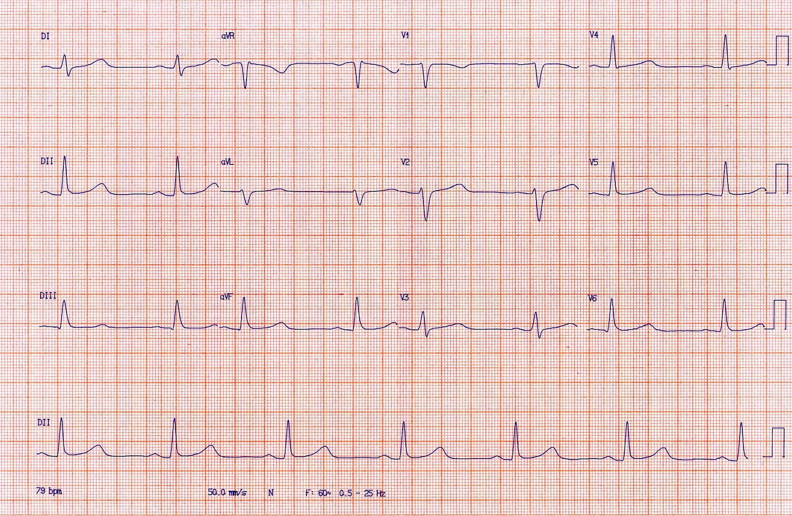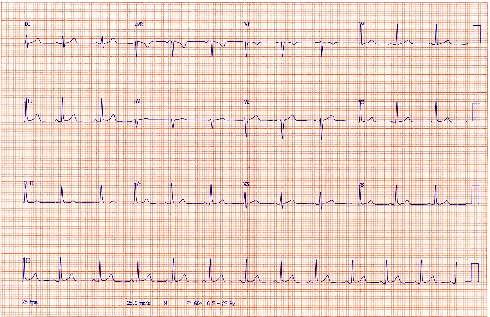 Da mesma forma, se configurarmos para 50mm/s, poderíamos realizar o diagnóstico de bradicardia ou distúrbio de condução intra-ventricular quando não há nenhuma alteração, como no exemplo abaixo (do mesmo paciente anterior):