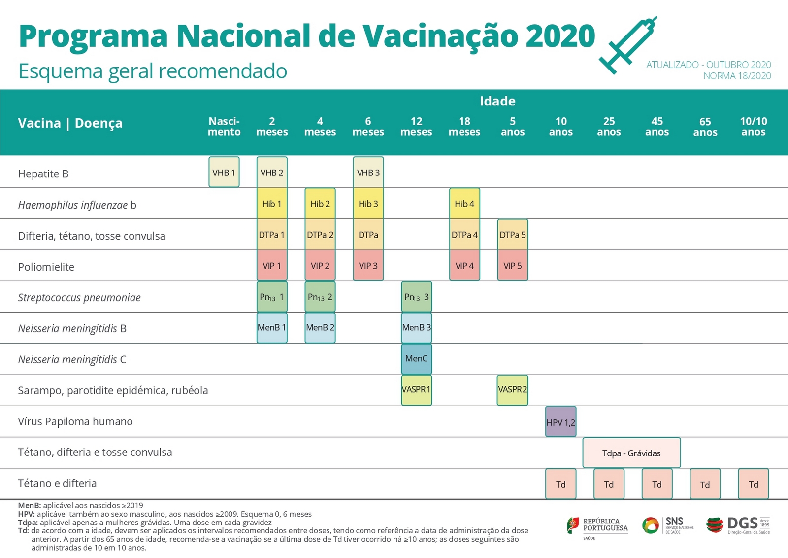 | Aos 2 meses | ● Vacina hexavalente (ou seja, 6 em 1) que inclui a segunda dose contra a hepatite B, a primeira dose contra doença invasiva por Haemophilus influenzae b (que pode ser causa de meningite, endocardite, infeção generalizada e outras infeções graves), a primeira dose contra a difteria, tétano e tosse convulsa e, ainda, a primeira dose contra a poliomielite. |