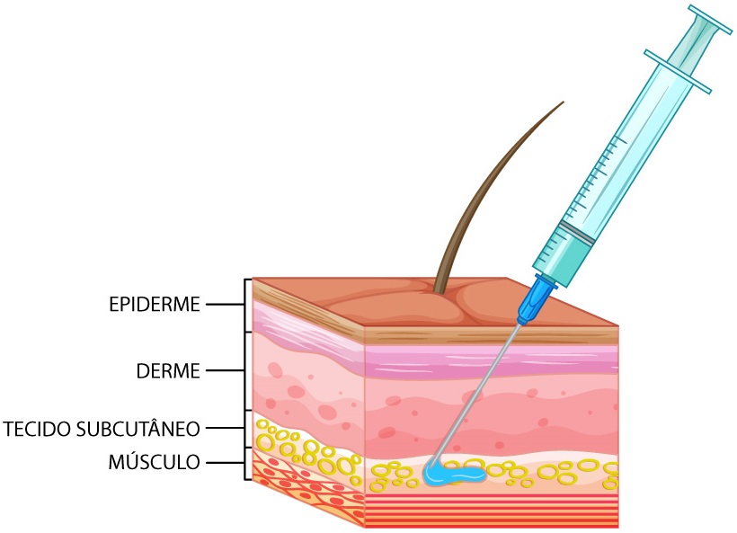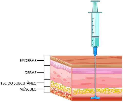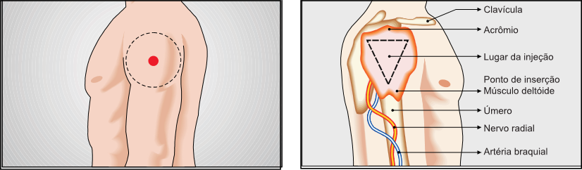 ● Os locais mais utilizados para injeções subcutâneas são as regiões do deltóide no terço proximal ou na face superior externa do braço, na face anterior da coxa ou na face anterior do antebraço.