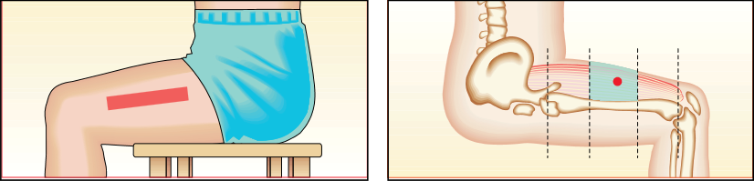 músculo vasto lateral da coxa, no terço médio da coxa, medido entre o joelho e o trocanter maior