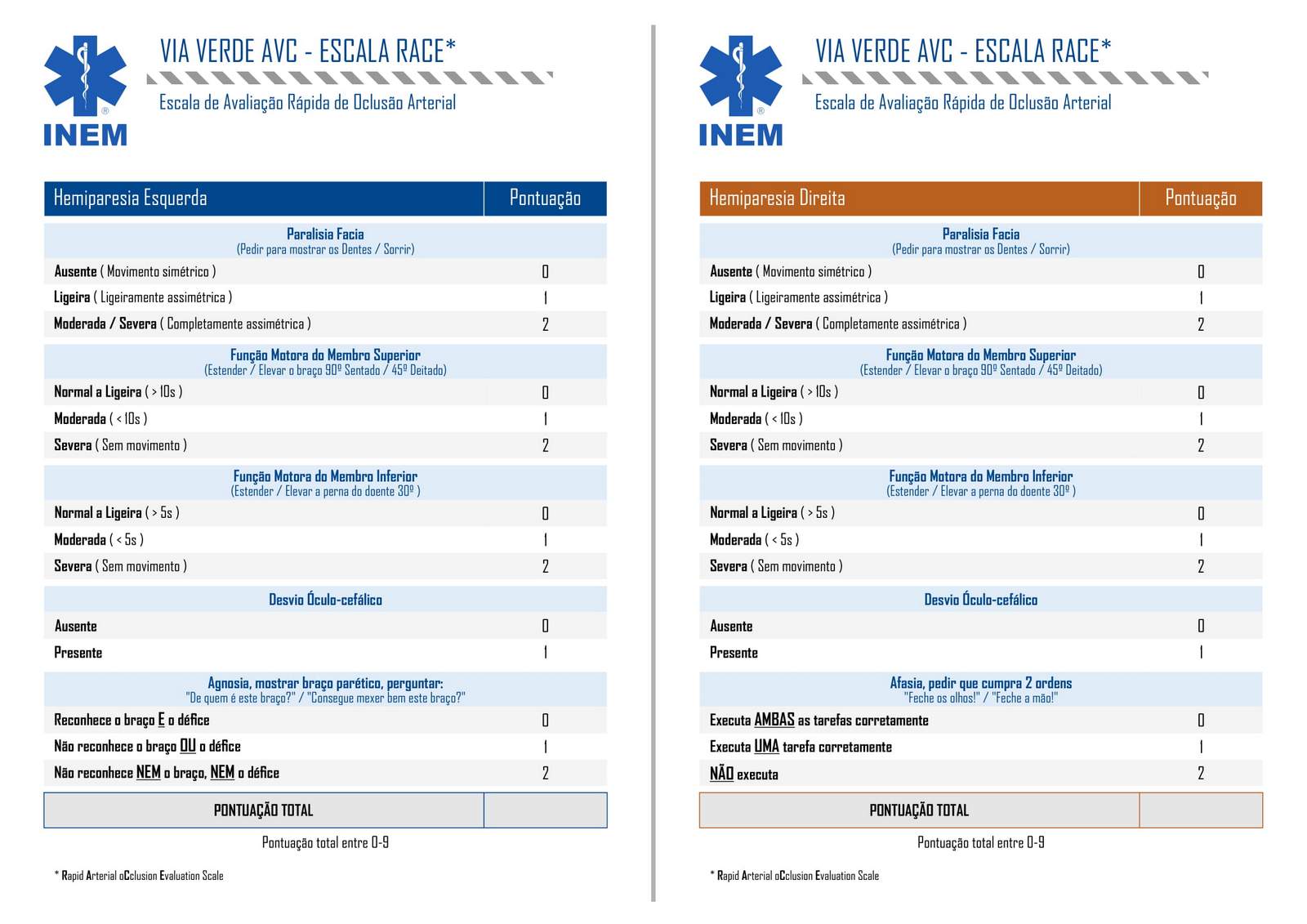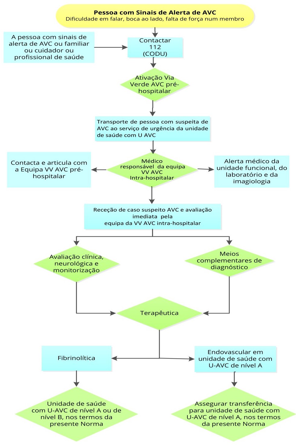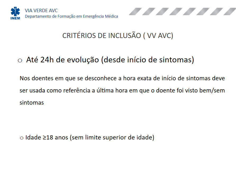| • Idade igual ou superior a 18 anos; • Inicio dos sintomas há menos de 4,5 horas • Diagnóstico clínico com défice neurológico • TAC CE sem hemorragia; Ter especial atenção, quando sintomas iniciaram há 3 - 4.5h • Idade superior a 80 anos; • AVC prévio; • Diabetes Mellitus; • Anti-coagulante oral (INR <1.7 ou TTP > 15s); • Inibidores da trombina ou do factor Xa com coagulação alterada; • NIHSS superior a 25; • TC-CE com enfarte superior 33% da Artéria cerebral média. |