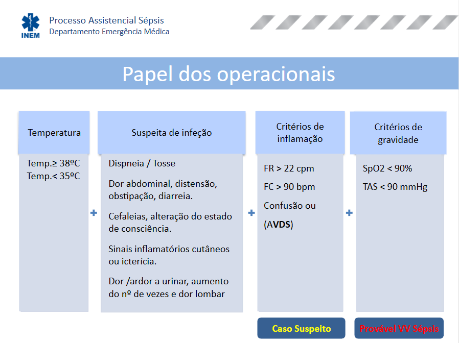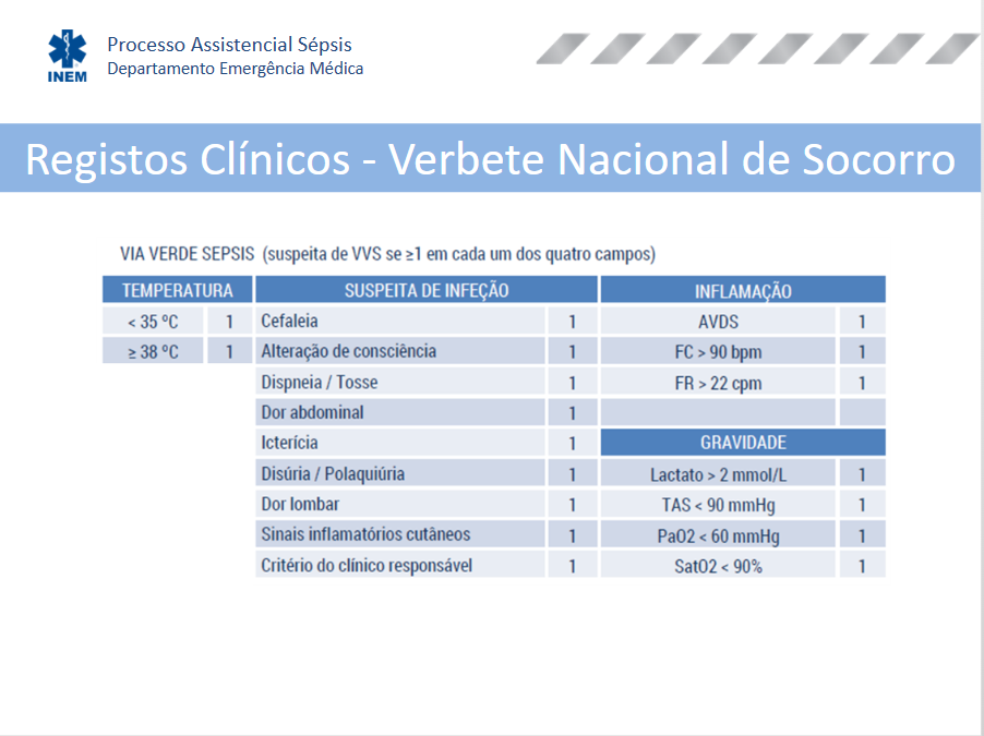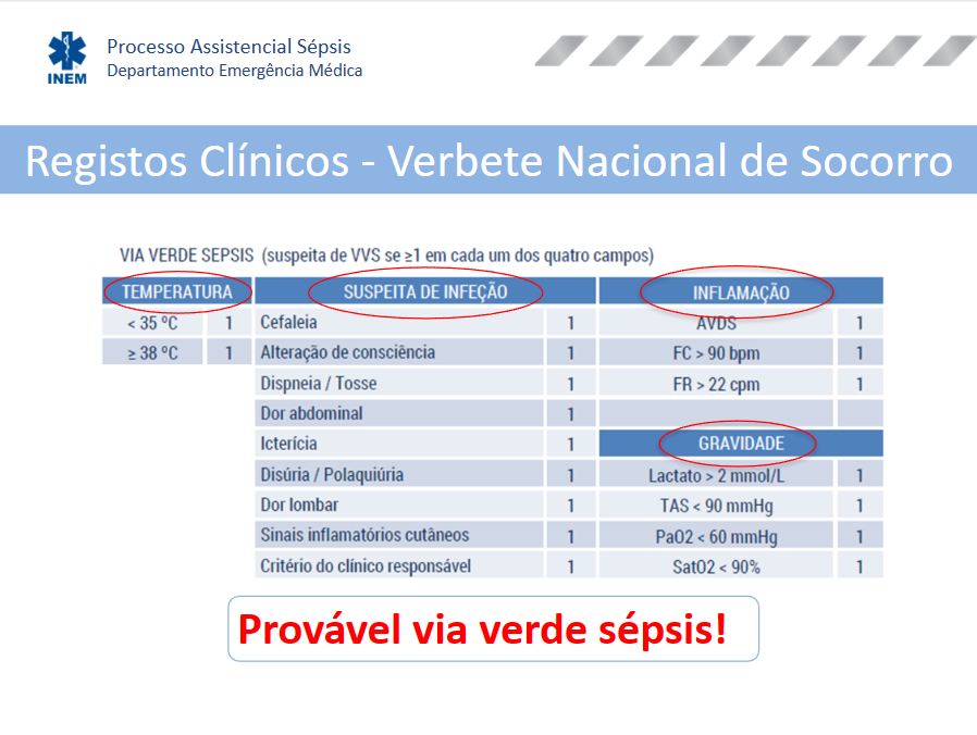 Os casos suspeitos para ativação de Via Verde Sépsis no Adulto, é definido como a presença de um critério de presunção de infeção e, simultaneamente, pelo menos, de um critério associado a inflamação sistémica .